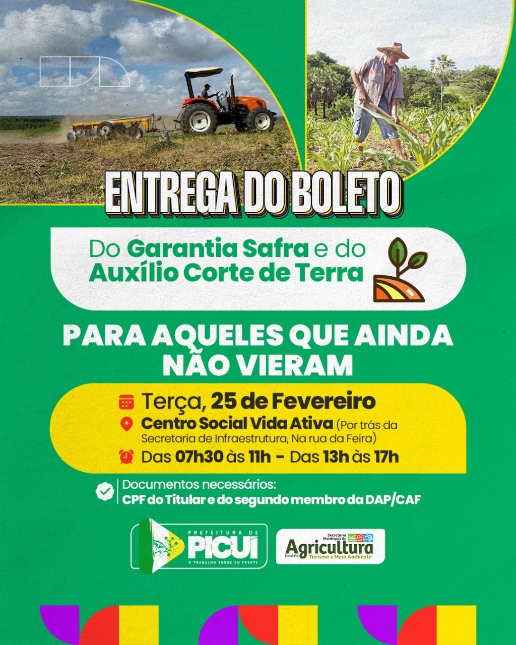 A Prefeitura Municipal de Picuí, por meio da Secretaria de Agricultura, Turismo e Meio Ambiente, realiza nesta terça-feira, dia 25 de fevereiro, a entrega dos boletos do programa Garantia Safra e do Auxílio Corte de Terra para os agricultores que ainda não compareceram. A ação acontecerá no Centro Social Vida Ativa, localizado por trás da Secretaria de Infraestrutura, na rua da Feira. O atendimento será das 07h30 às 11h e das 13h às 17h.
