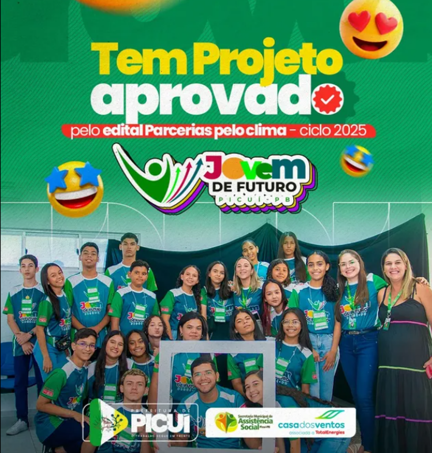 A Prefeitura de Picuí, por meio da Secretaria Municipal de Assistência Social, celebra a aprovação de mais um importante projeto voltado à juventude do município. O Projeto Jovem de Futuro foi contemplado no edital Parcerias pelo Clima – Ciclo 2025, uma iniciativa que visa incentivar ações sustentáveis, educativas e transformadoras em todo o Brasil.