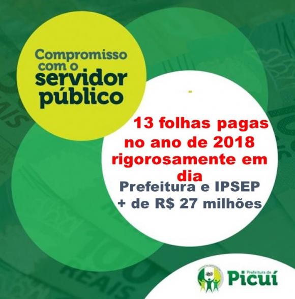A Prefeitura de Picuí realizou na manhã desta sexta-feira (28) o último pagamento da folha de 2018. Ao todo, são 26 pagamentos em dia, incluindo na conta o 13º salário dos anos 2017 e 2018. O Governo da Participação reitera o compromisso com o servidor público municipal. Ao todo, somando os pagamentos da prefeitura e do Instituto de Previdência Municipal, esse ano já foram pagos mais de 27 milhões de reais aos servidores da ativa e da