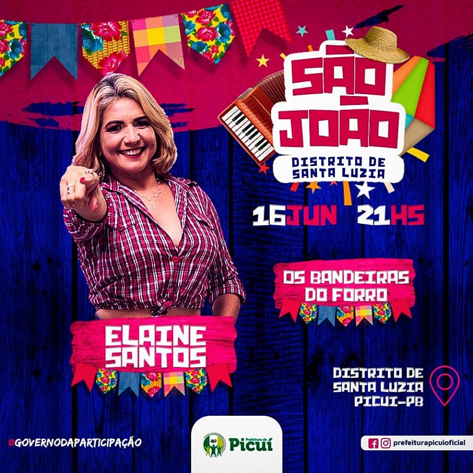 Neste domingo (16), Santa Luzia do Seridó, distrito de Picuí, estará vivenciando suas festividades juninas de 2019. De acordo com o prefeito Olivânio Remígio, a animação ficará por conta do forró pé de serra dos ‘Bandeiras do Forró’ e da cantora Elaine Santos – a revelação do forró romântico.