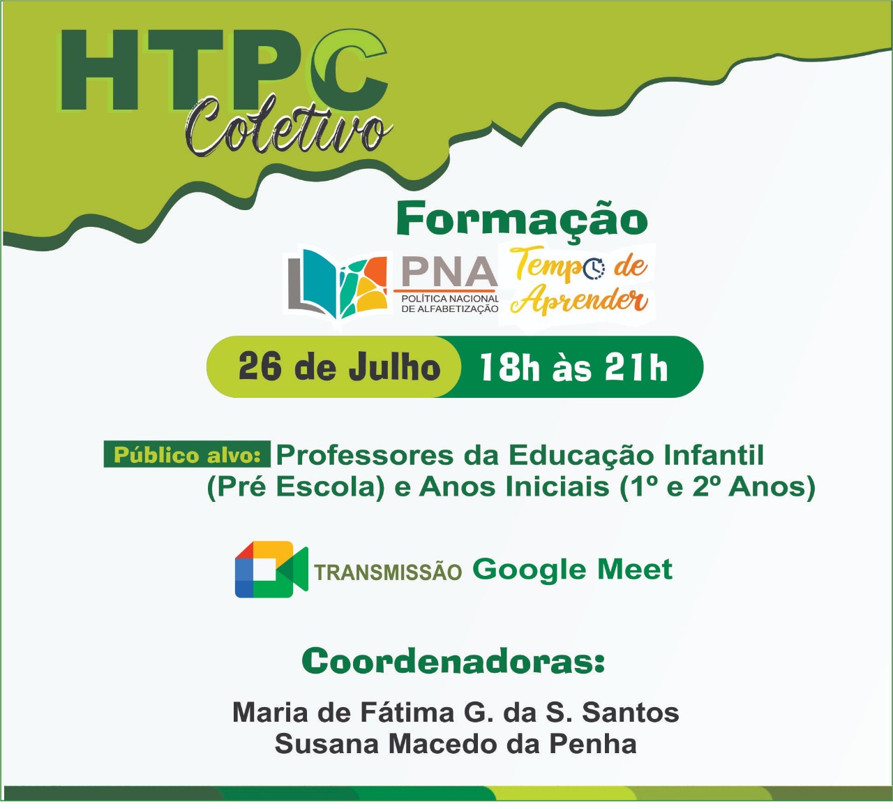 No dia 27 de julho, foi realizada pelo serviço de orientação e psicologia da Rede Municipal de Ensino uma formação dentro do Horário de Trabalho Pedagógico Coletivo – HTPC, para os professores da Educação infantil e Ciclo Complementar(3º,4º e 5º anos), Ensino Fundamental, com o tema “UM NOVO OLHAR PARA A EDUCAÇÃO: desafio do retorno presencial”, com transmissão pelo Google Meet.