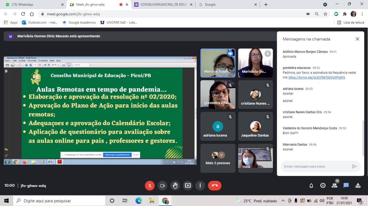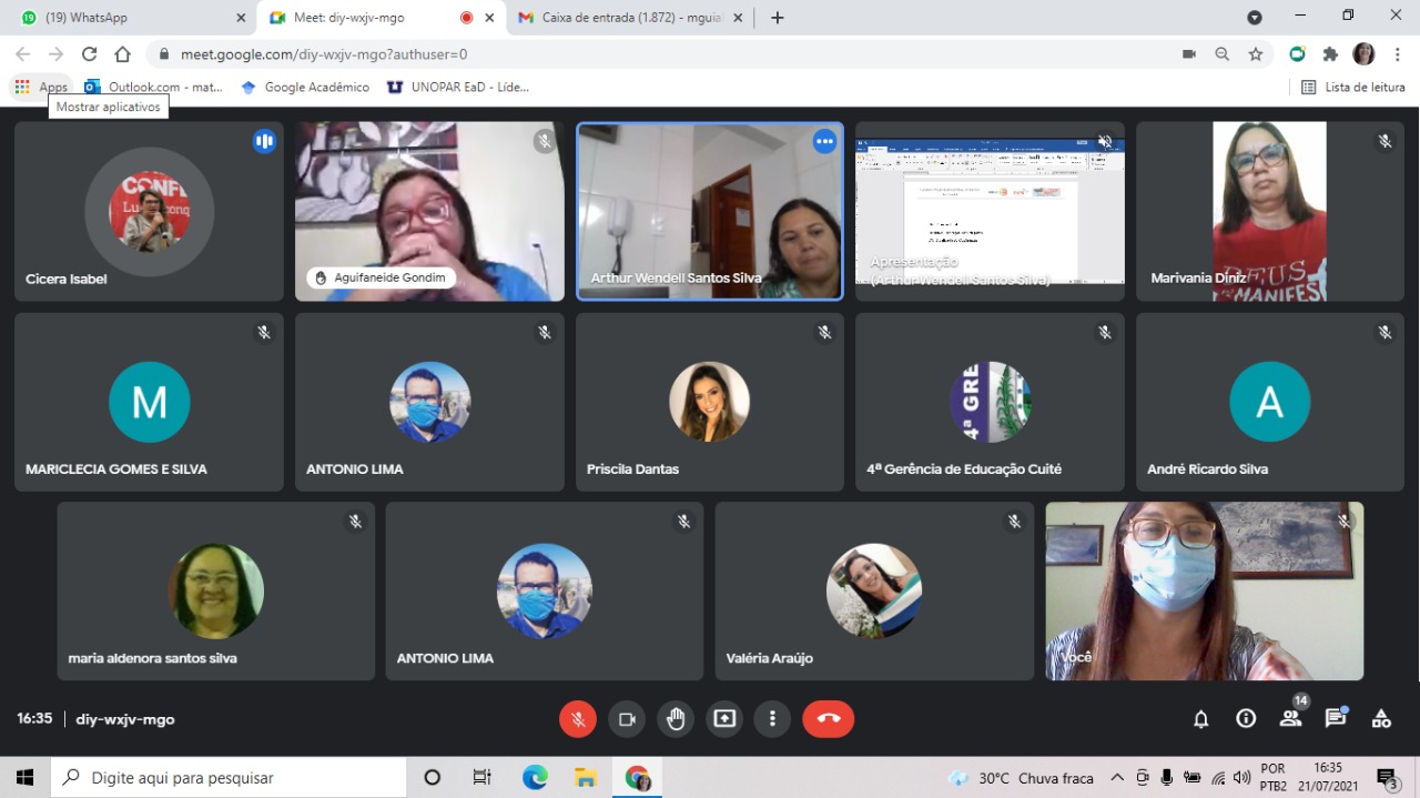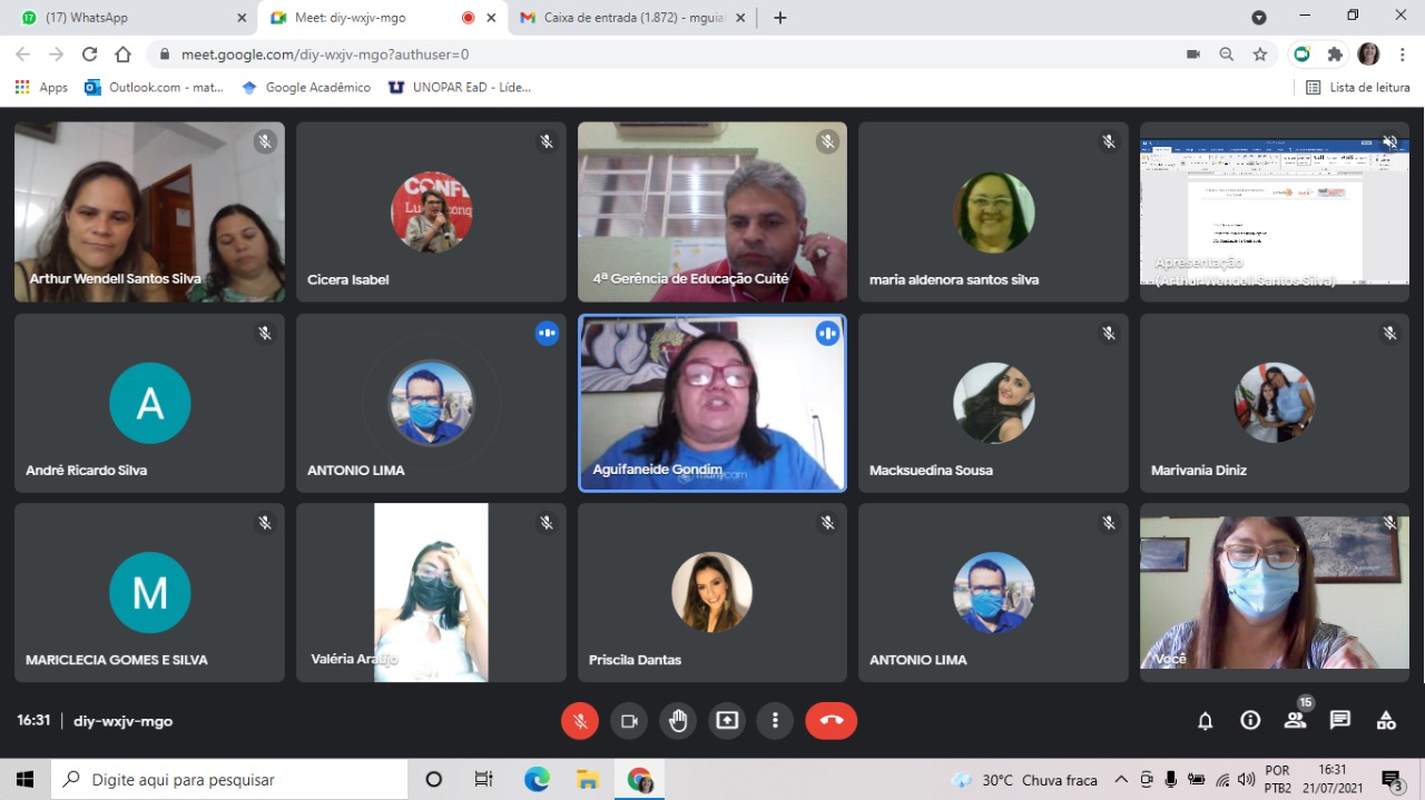 A Política Educacional segue em um ritmo muito acelerado, mesmo de forma virtual com as discussões da Conferência Popular de Educação da Região do Curimatáe Seridó Paraibano, que será realizada II CONFERÊNCIA INTERMUNICIPAL POPULAR DE EDUCAÇÃO acontecerá dia 17 de agosto de 2021, na 4ª Regional de Ensino. A secretária de Educação, Maria da Guia Lucena, e a coordenadora Valéria Araújo participaram no dia 21 de julho da reunião para planejamento da Conferência Popular de Educação da Região do Curimataú e Seridó Paraibano (CONAPE) virtual.