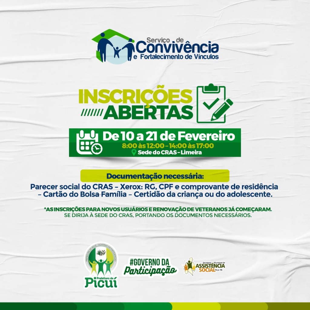 A Prefeitura Municipal de Picuí, através da Secretaria de Assistência Social, vem a público comunicar que Serviço de Convivência e Fortalecimento de Vínculos (SCFV) está com as inscrições abertas para 2020. O SCFV é um serviço da Proteção Social Básica do SUAS que é ofertado de forma complementar ao trabalho social com famílias, em que realiza atendimentos em grupo. São promovidas atividades artísticas, culturais, de lazer e esportivas, dentre outras, de acordo com a idade dos usuários. Trata-se de uma intervenção social planejada que cria situações desafiadoras, estimulando e orientando os usuários na construção e reconstrução de suas histórias e vivências individuais, coletivas e familiares. Para Maiores informações e realização das inscrições, procure o Centro de Referência da Assistência Social (CRAS) de Picuí, que fica localizado no bairro Limeira.