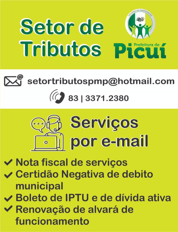 O Setor de Tributos do município está com o atendimento ao público suspenso, em virtude do Decreto Municipal, nesse período de isolamento social. Para qualquer solicitação ao Setor de Tributos, favor entrar em contato pelo e-mail setortributospmp@hotmail.c