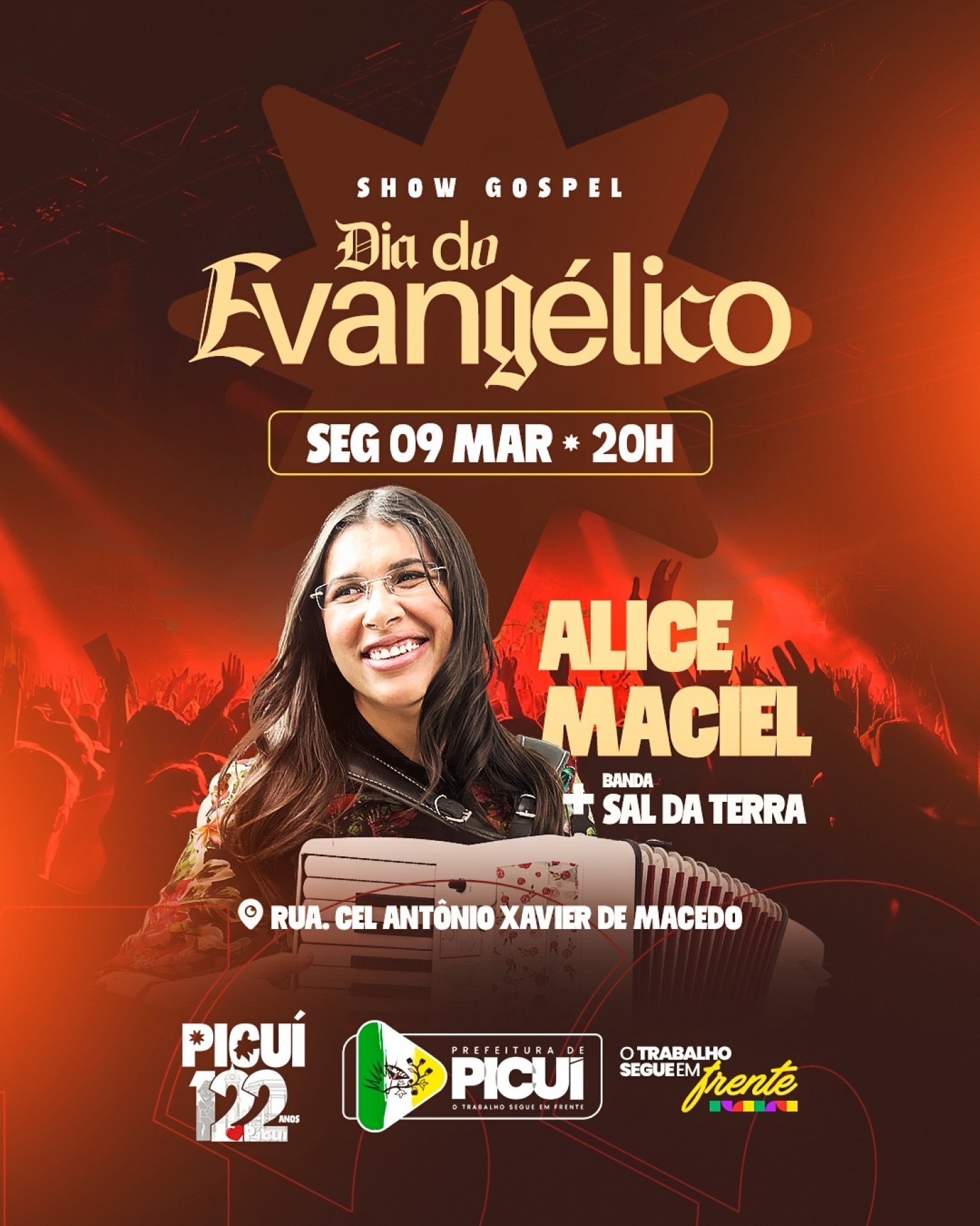 A cidade de Picuí viverá uma noite especial de fé, música e celebração na próxima segunda-feira, 09 de março, quando acontecerá o Show Gospel em comemoração ao Dia do Evangélico. O evento integra a programação festiva pelos 122 anos de emancipação política do município.