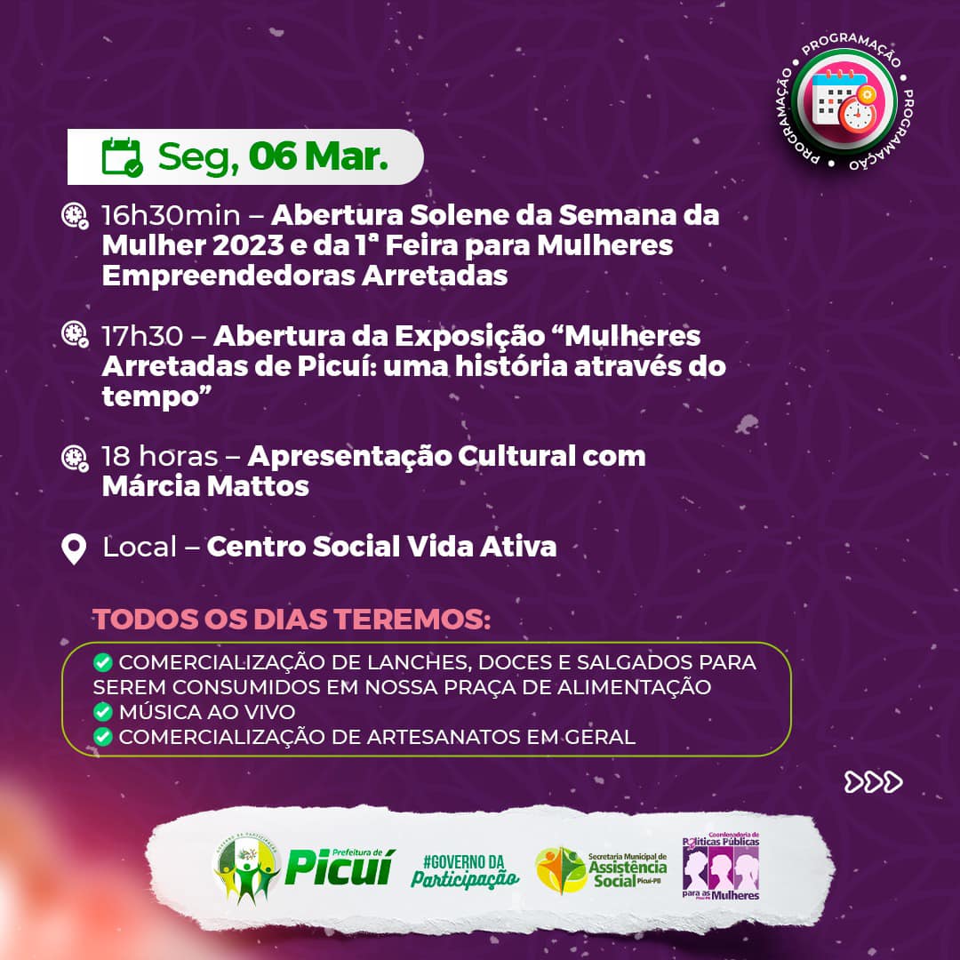 A partir da próxima segunda-feira, 06 de março, começa a primeira edição da "Feira para Mulheres Arretadas de Picuí" , que contará com muitas novidades feitas por mulheres e para as mulheres picuienses, no Centro Social Vida Ativa e seguirá com uma diversa programação cultural nos dias 7 e 8 de março, em alusão ao Dia Internacional da Mulher.