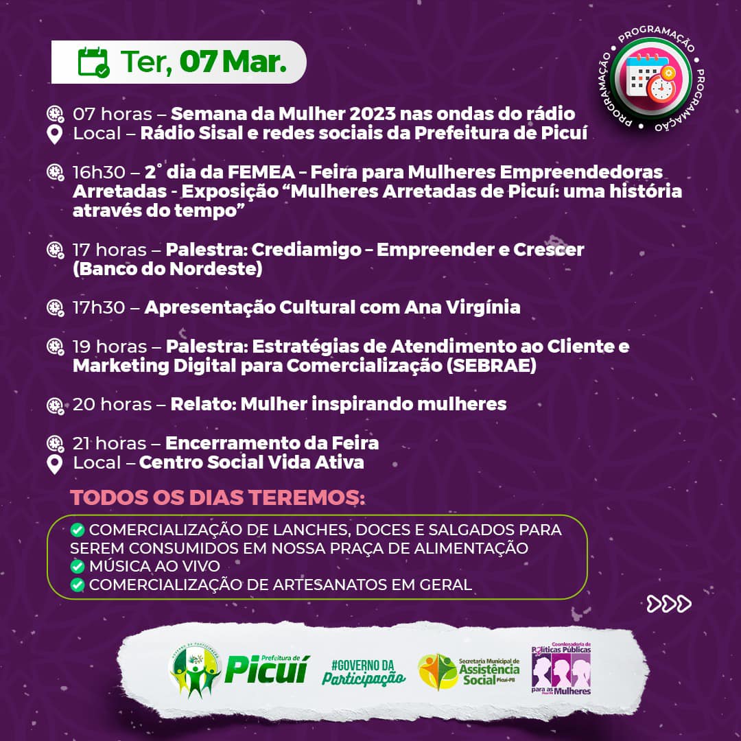 Segundo informações fornecidas pela Secretaria Municipal de Assistência Social, este importante evento será possível em parceria com a Coordenadoria de Políticas Públicas para as Mulheres, de forma a empoderar as mulheres picuienses que são empreendedoras, dando maior visibilidade aos seus produtos e serviços comercializados e, para além disso, fomentar discussões e reflexões com apresentações culturais, exposições artísticas, palestras e momentos de construção do conhecimento sobre empreendedorismo feminino, marketing digital, dentre outras pautas relevantes.