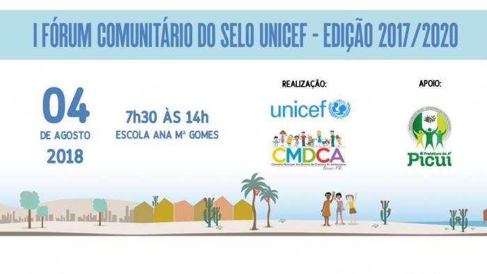 O Município de Picuí tem a honra de convidar toda a população para participar do I Fórum Comunitário do Selo Unicef – Edição 2017/2020, que acontecerá no dia 04de agosto, a partir das 7h30min, na Escola Ana Maria Gomes, localizada na Rua Padre Apolônio Gaudêncio, 300, Bairro Monte Santo.