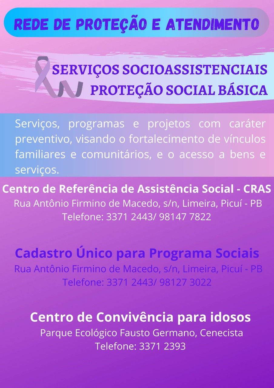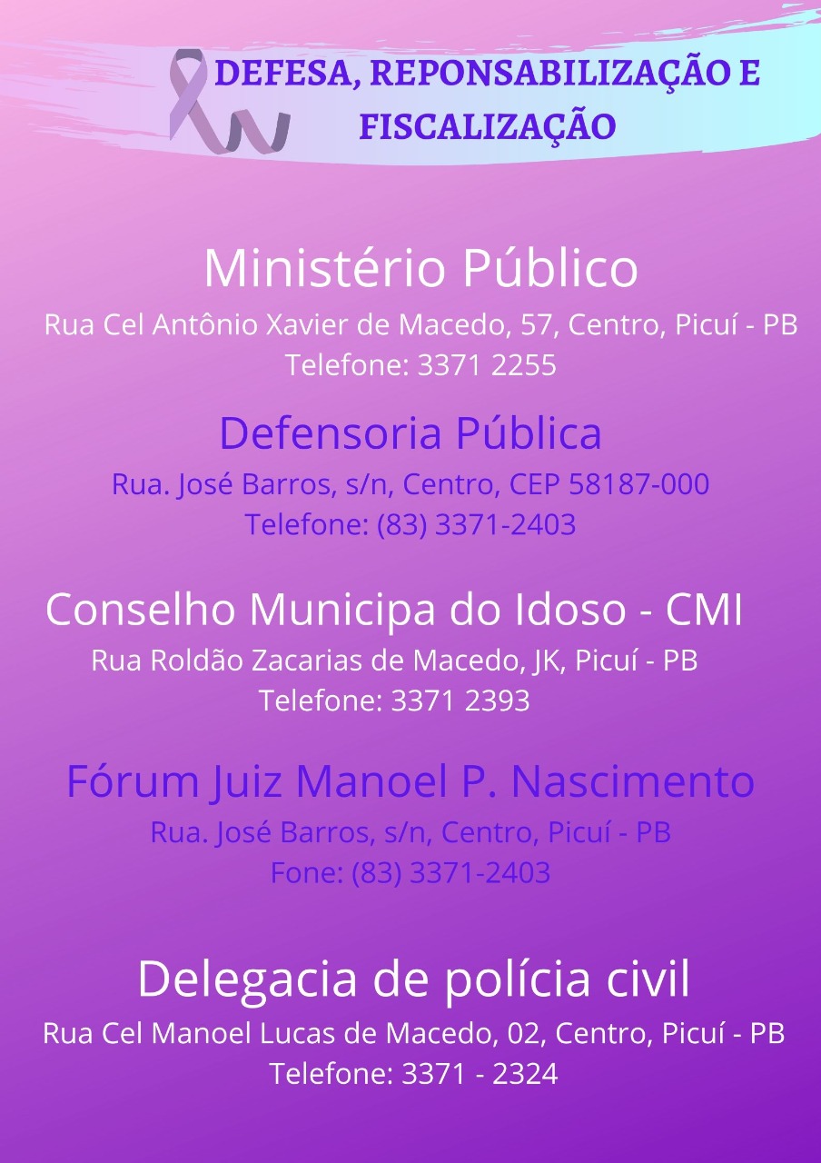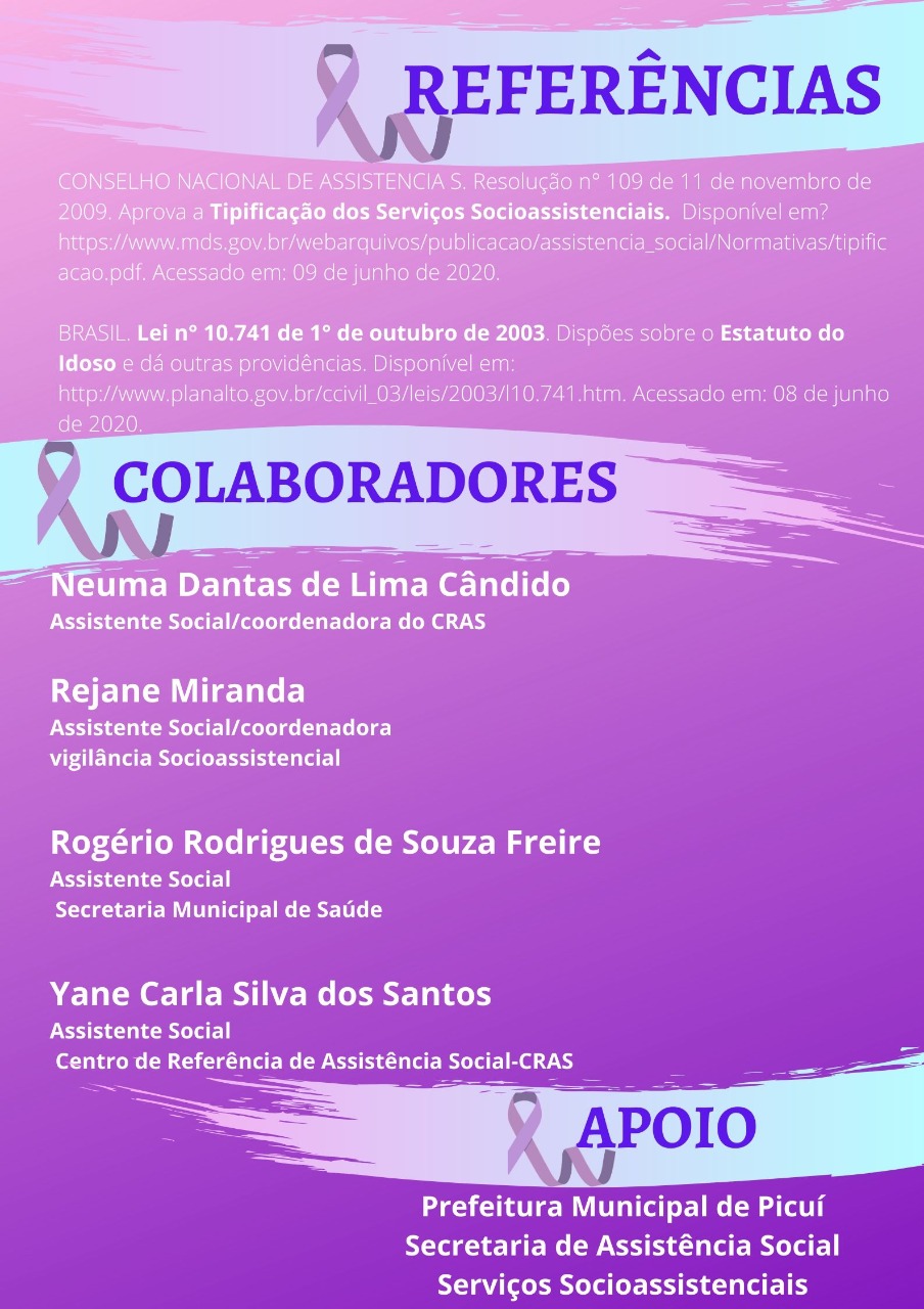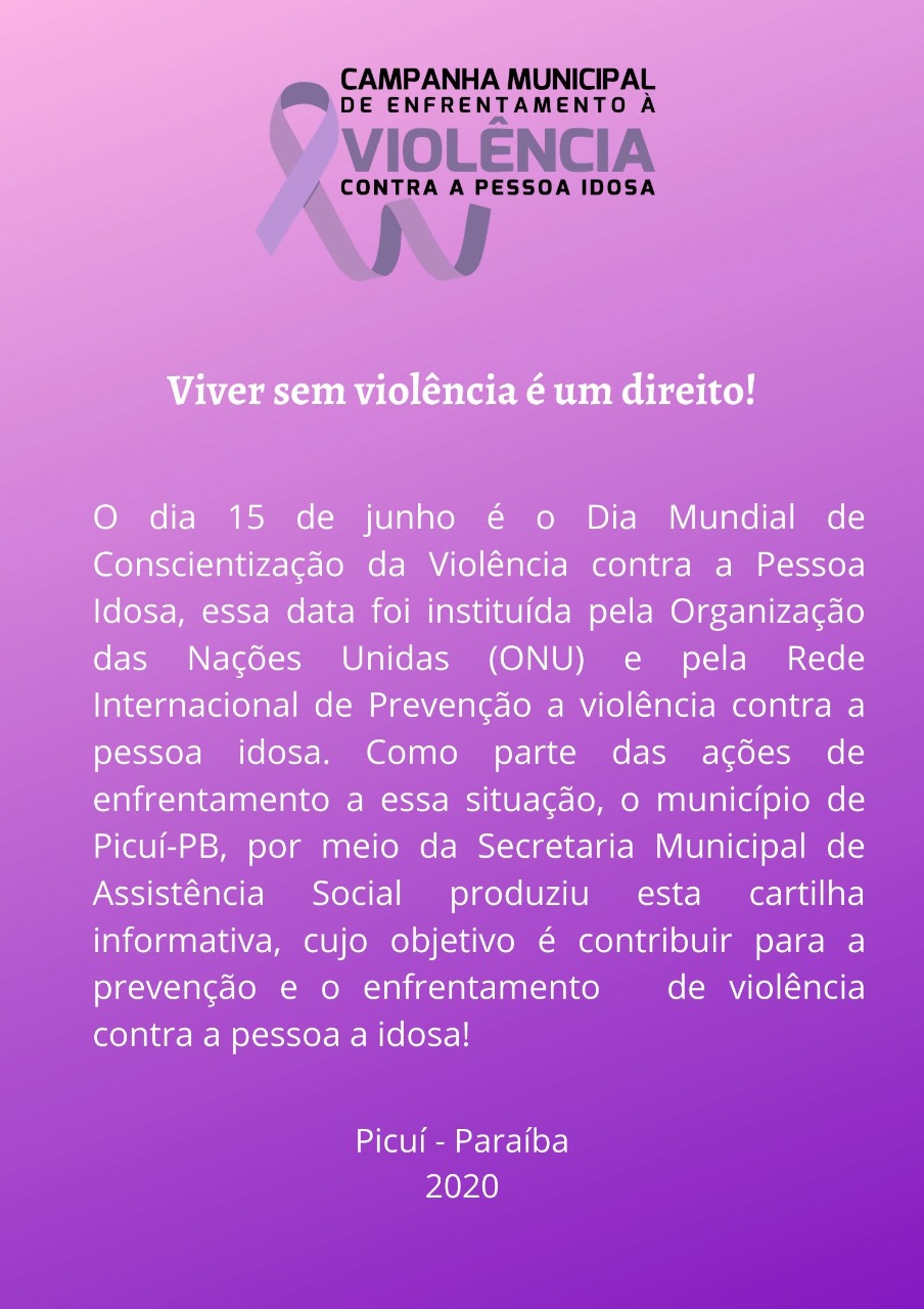 A seguir, encontra-se disponibilizada a Cartilha informativa para que a sociedade civil picuiense possa tomar conhecimento desta importante campanha se conscientizando e disseminando conhecimentos e informações pertinentes pela garantia de direitos da pessoa idosa, podendo também fazer parte da rede de proteção denunciando possíveis casos de violência e protegendo os idosos, da melhor forma possível.