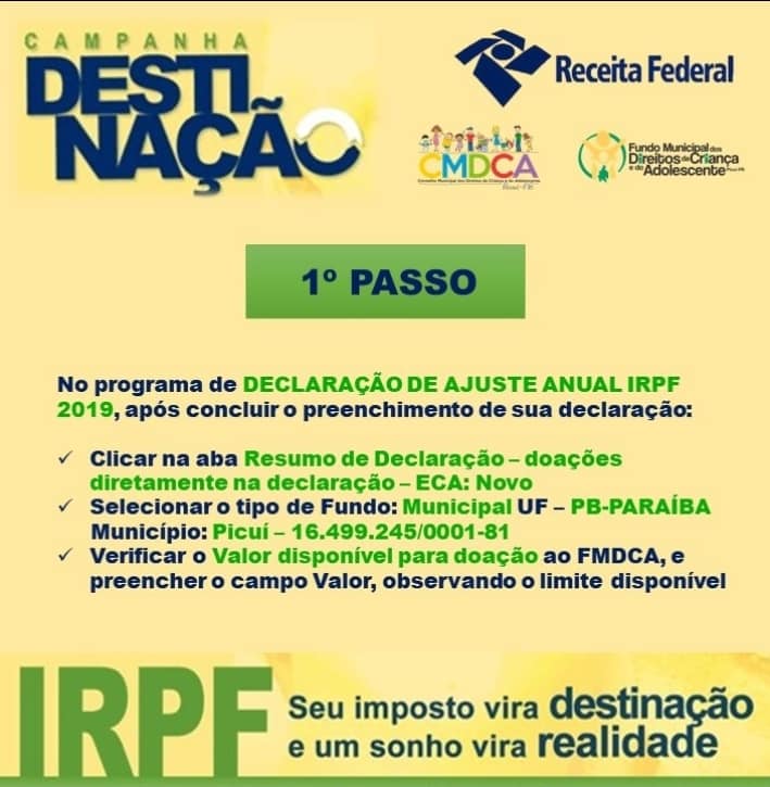 O Projeto Destinação trata-se de uma iniciativa da Receita Federal e tem por finalidade destinar parte do imposto devido por pessoas físicas e empresas para determinados Fundos, nos quais os valores deverão beneficiar as crianças, adolescentes e idosos. Nos municípios paraibanos, as doações são realizadas durante o período de entrega da declaração.