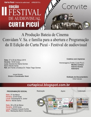 A Prefeitura de Picuí, através do Departamento Municipal de Cultura, apoia a realização da II edição do CURTA PICUÍ - Festival de Audiovisual, que será realizado no próximo fim-de-semana, de 27 a 29 de março, na Escola Municipal Ana Maria Gomes, a partir das 19h.