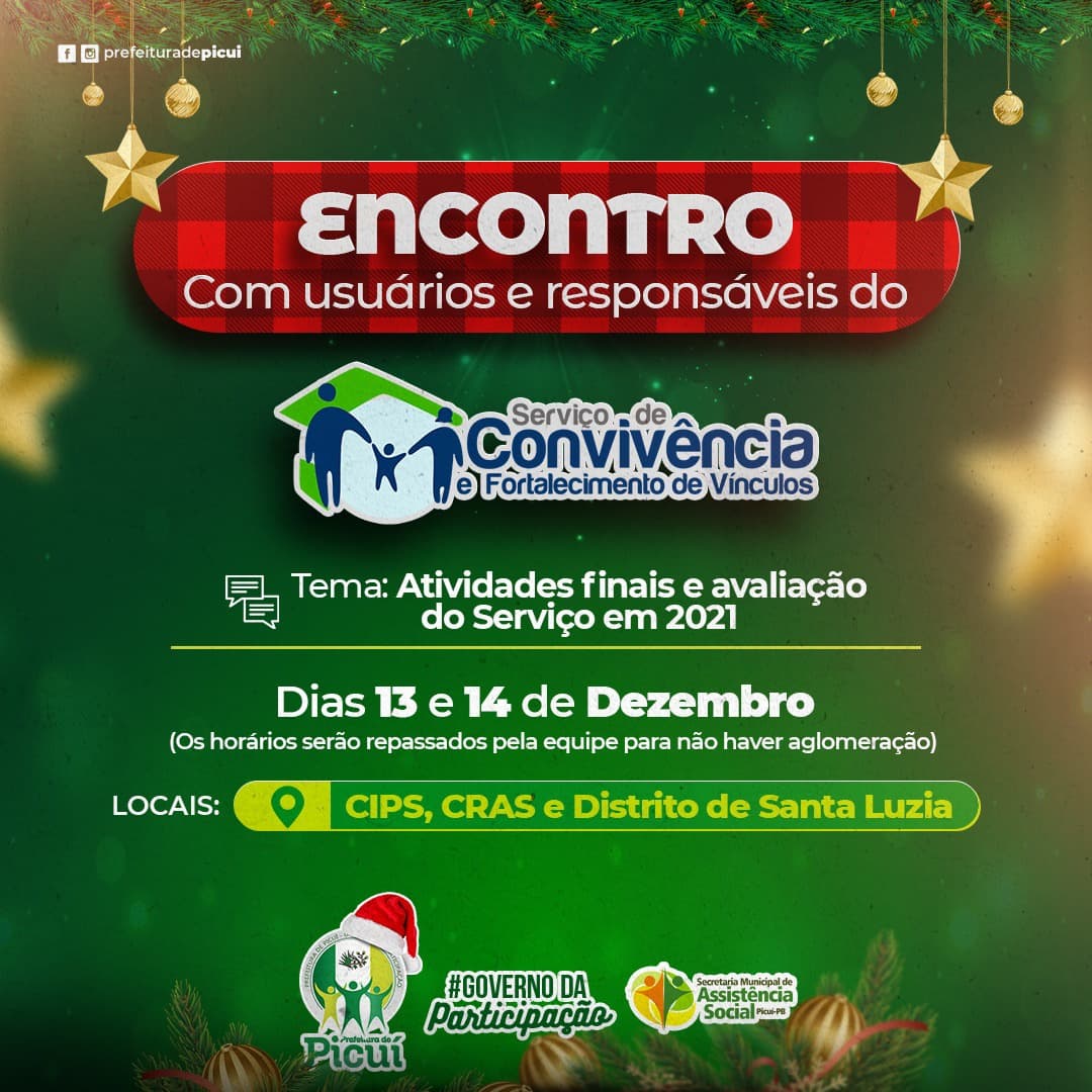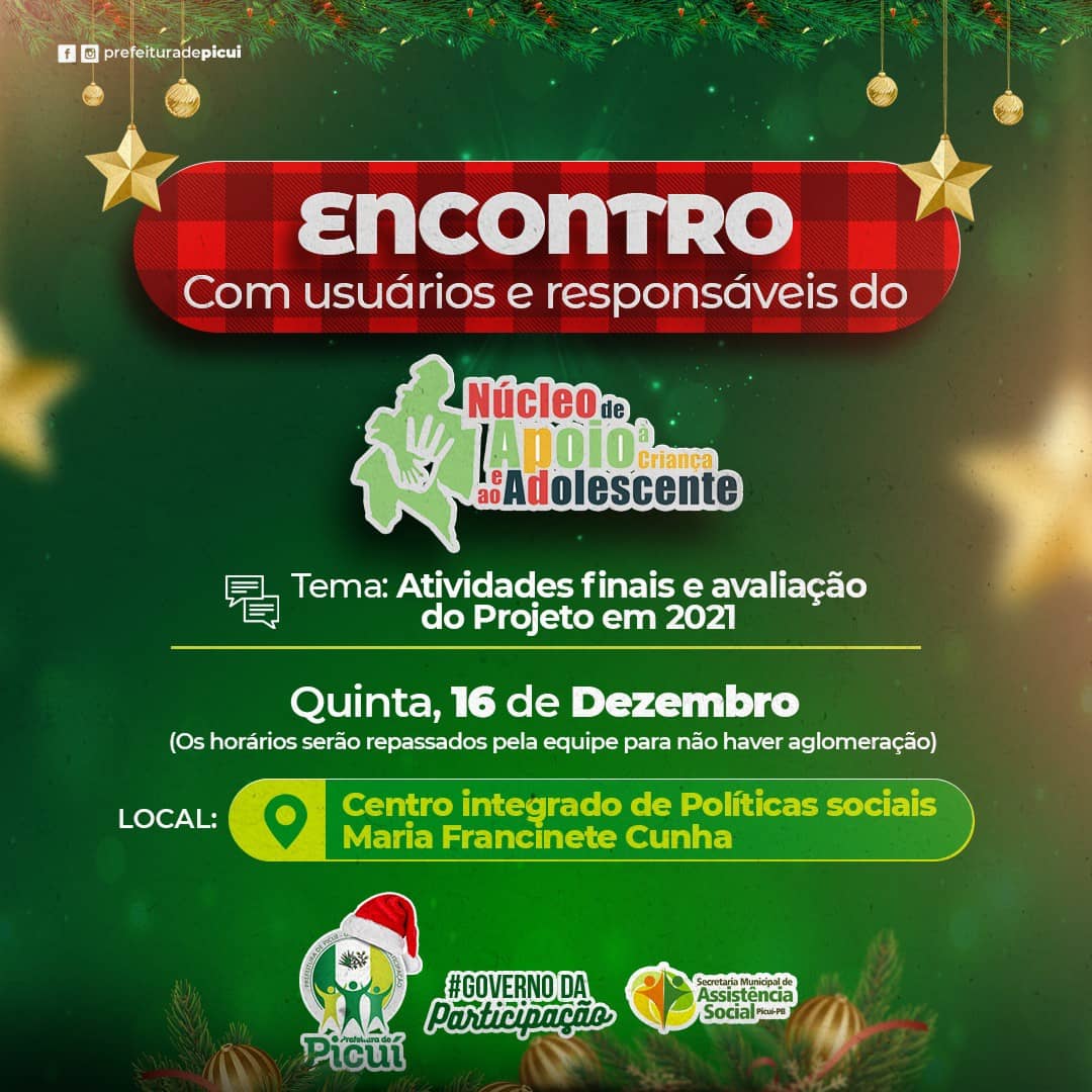 Vale ressaltar que é de fundamental importância que as crianças, adolescentes, mulheres e idosos beneficiários dos programas e projetos sociais de Picuí possam comparecer no día, local e horário marcado, de modo que as equipes técnicas da Secretaria de Assistência Social estarão aguardando para um encontro especial. Confiram os locais, datas e horários de cada programa/projeto social, logo abaixo: