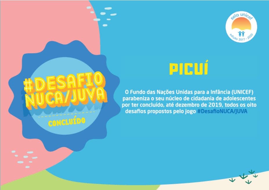 Em setembro de 2019, durante a capacitação para mobilizadores dos NUCAS na Paraíba, a equipe de adolescentes do UNICEF criou e apresentou uma forma ainda mais divertida para engajar os núcleos de cidadania de adolescentes (NUCAs/JUVAs) na realização dos oito desafios propostos pela metodologia do Selo UNICEF, o #DesafioNUCA/JUVA, que consistia em uma certificação para os municípios que conseguissem até 16 de dezembro concluir todos os desafios e postar na Plataforma Crescendo Juntos.