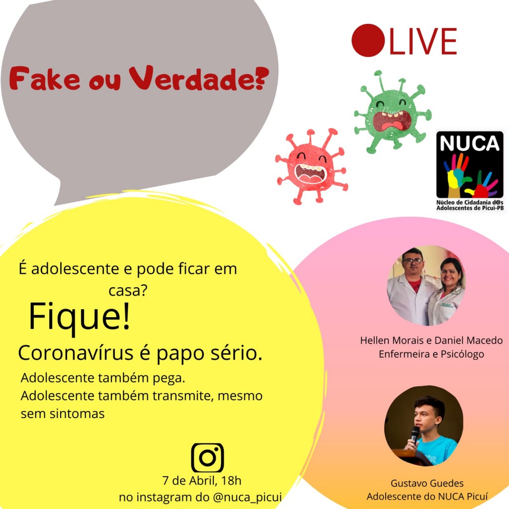 O Núcleo de Cidadania de Adolescentes do município de Picuí (NUCA), percebendo que a pandemia do coronavírus tem tido grande repercussão nos veículos de comunicação, especialmente nas mídias sociais digitais, a fim de esclarecer se as notícias são fato ou fake, realizará uma live socioeducativa às 18h de hoje (07/04) com a enfermeira Hellen Morais e o Psicólogo Daniel Macedo.