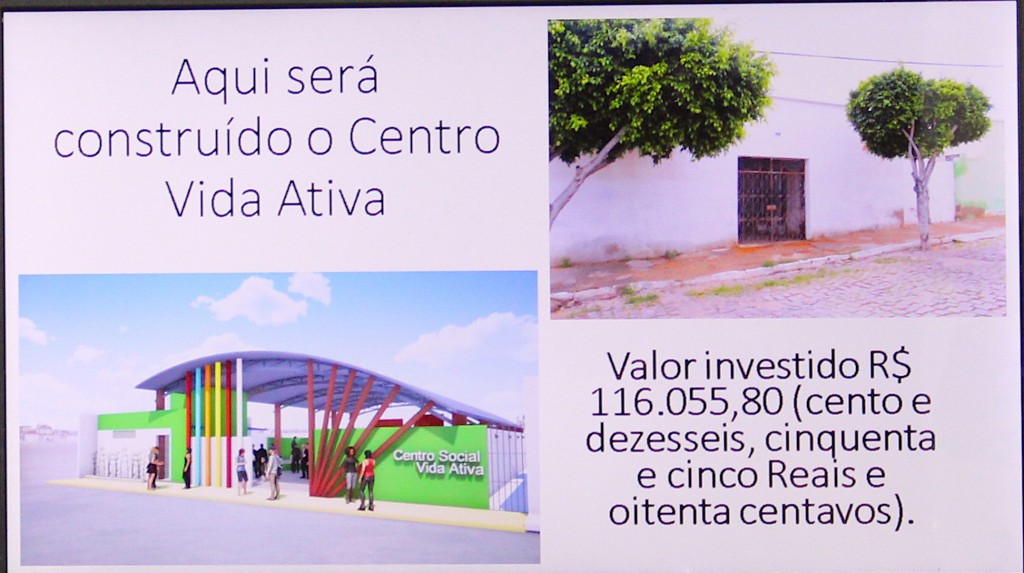 O Centro Social Vida Ativa será construído no antigo almoxarifado municipal e serão investidos cerca de R$ 116.055,80 (cento e dezesseis mil, cinquenta e cinco reais e oitenta centavos), com recursos da assistência social, com o início previsto para a próxima segunda-feira, 27 de abril. O projeto conta ainda com a recuperação dos banheiros do antigo mictório.