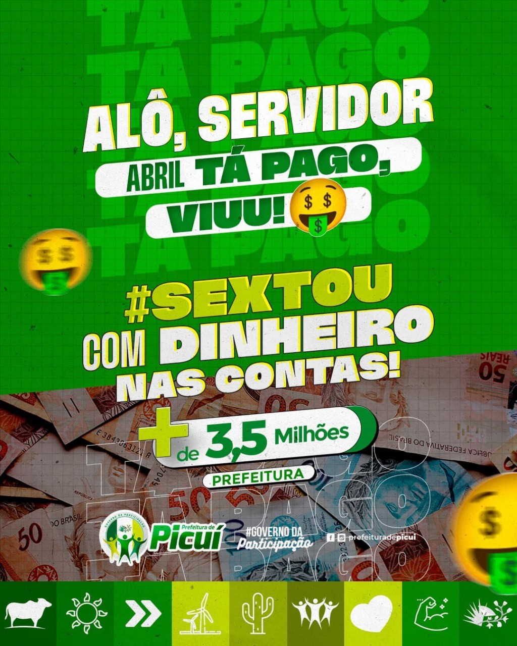 Segundo o Secretário de Finanças, Márcio Renato, a folha da Prefeitura de Picuí neste mês foi de R$ 3.544.000,00, e a do Instituto de Previdência Social dos Servidores da Prefeitura de Picuí – IPSEP – foi de mais de R$ 947.000,00 – totalizando R$ 4.491.000,00, possibilitando movimentar consideravelmente a economia local.