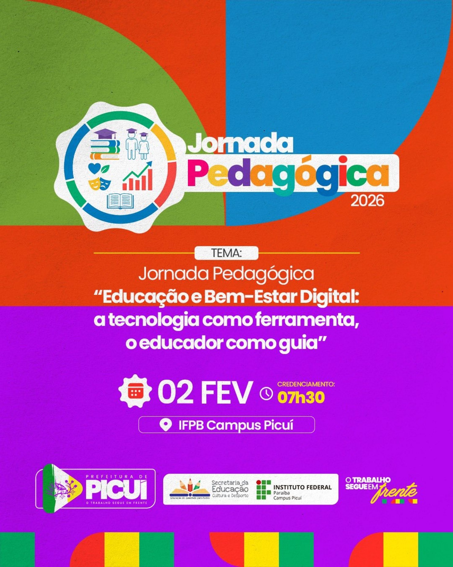 Com foco na formação continuada, no diálogo e nos desafios da educação contemporânea, a Prefeitura de Picuí, por meio da Secretaria Municipal de Educação, Cultura e Desporto, realiza no próximo dia 02 de fevereiro, no IFPB – Campus Picuí, a Jornada Pedagógica 2026, voltada à Rede Municipal de Ensino. O evento conta com o apoio do Instituto Federal da Paraíba – Campus Picuí, fortalecendo a parceria institucional em prol da educação pública de qualidade.