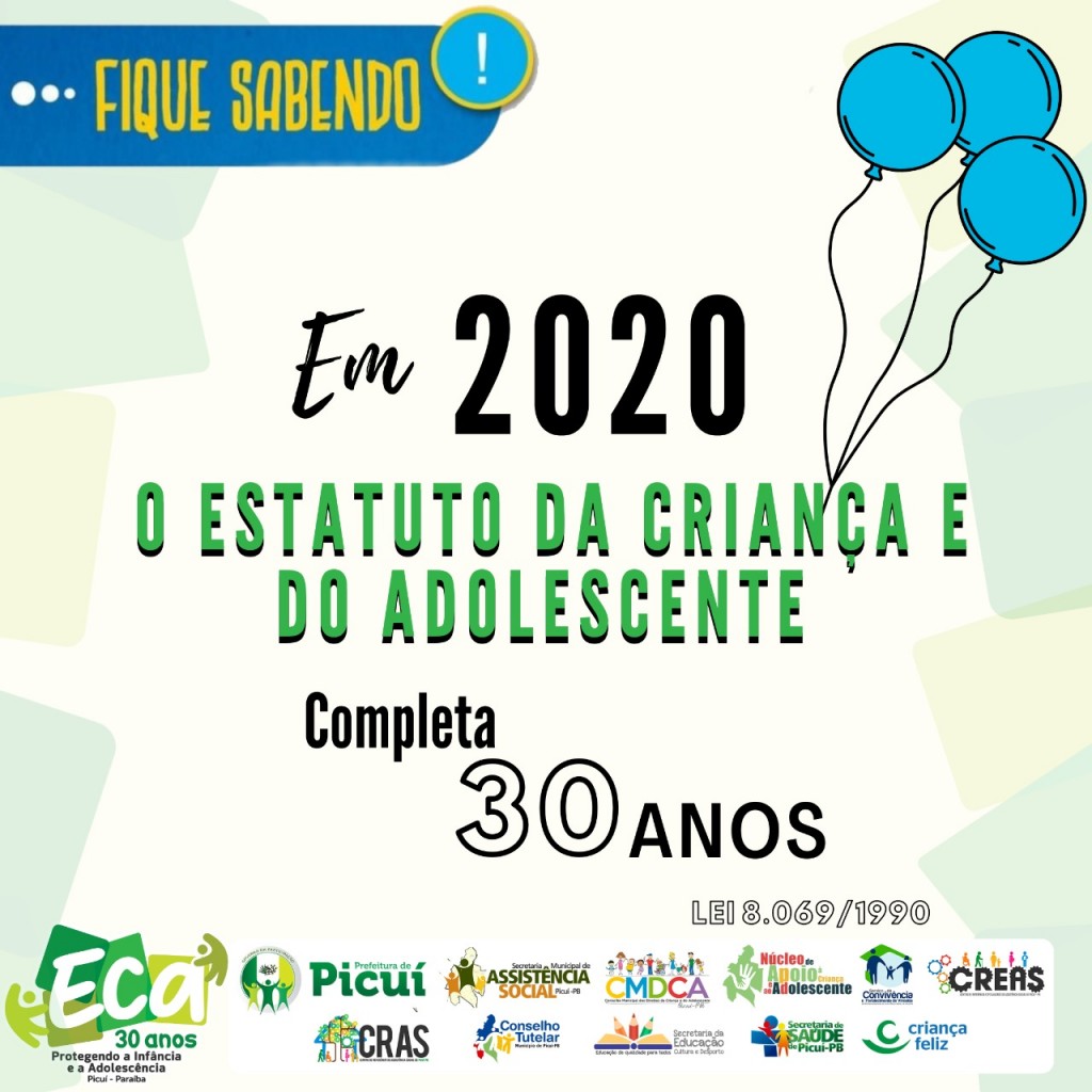 Neste dia 13 de julho de 2020, o Estatuto da Criança e do Adolescente (Lei 8.069/1990) completa 30 anos. Trata-se da lei mais importante no reconhecimento e na proteção dos direitos de crianças e adolescentes. A sua criação possibilitou que meninas e meninos passassem a ser vistos como sujeitos de direitos. Visto isso, a Prefeitura Municipal de Picuí - Governo da Participação estará realizando ao longo desta semana a Campanha Municipal ECA 30 anos: Protegendo a Infância e a Adolescência.