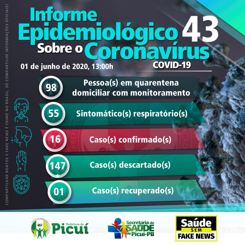 De acordo com informações fornecidas pela vigilância epidemiológica, até o momento, o município de Picuí registra 16 casos confirmados de COVID-19, 1 caso recuperado e há cerca de 98 pessoas que estão cumprindo isolamento domiciliar com monitoramento das Equipes de Estratégia de Saúde da Família (ESFs).
