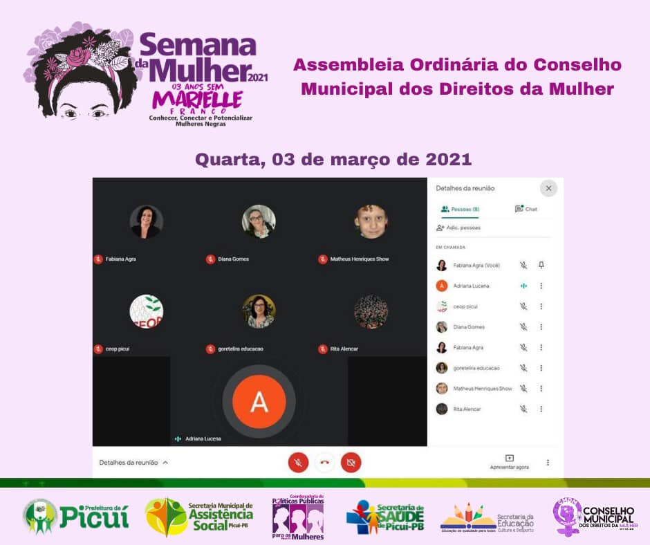 Seguindo a programação da Semana da Mulher 2021, o Conselho Municipal dos Direitos da Mulher realizou, nesta última quarta-feira (03), uma Assembleia Ordinária, que tratou acerca do tema trabalhado durante o evento, além de pontuar algumas ações necessárias para o início do projeto "Mulheres Negras de Picuí: conhecer, conectar e potencializar". Segundo a secretária de Assistência Social, Keiles Lucena, "é preciso conhecer para valorizar a história das mulheres e as secretarias de Assistência Social, de Educação e Saúde estão desenvolvendo atividades para pontuar a relevância destas pautas levantadas na Semana da Mulher 2021", pontuou.