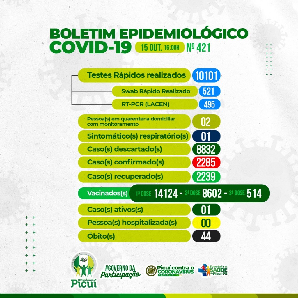 Segundo a Coordenadoria de Vigilância Epidemiológica, Picuí registra nesta sexta (15/10), dos 10101 testes rápidos realizados, 2285 casos confirmados, sendo 1 ativo, e há cerca de 2239 pessoas que estão recuperadas da doença.