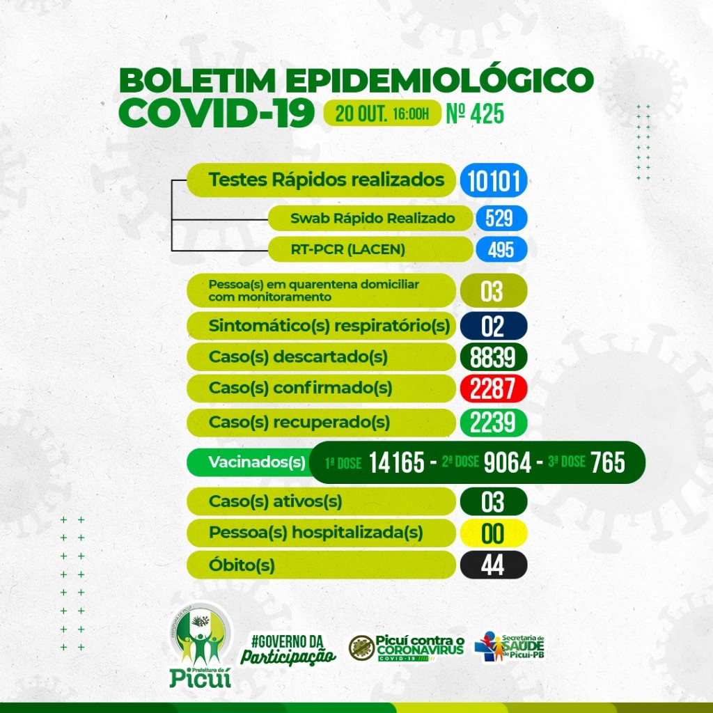 Segundo a Coordenadoria de Vigilância Epidemiológica, Picuí registra nesta quarta -feira(20/10), dos 10101 testes rápidos realizados, 2287 casos confirmados, sendo 3 ativos, e há cerca de 2239 pessoas que estão recuperadas da doença.