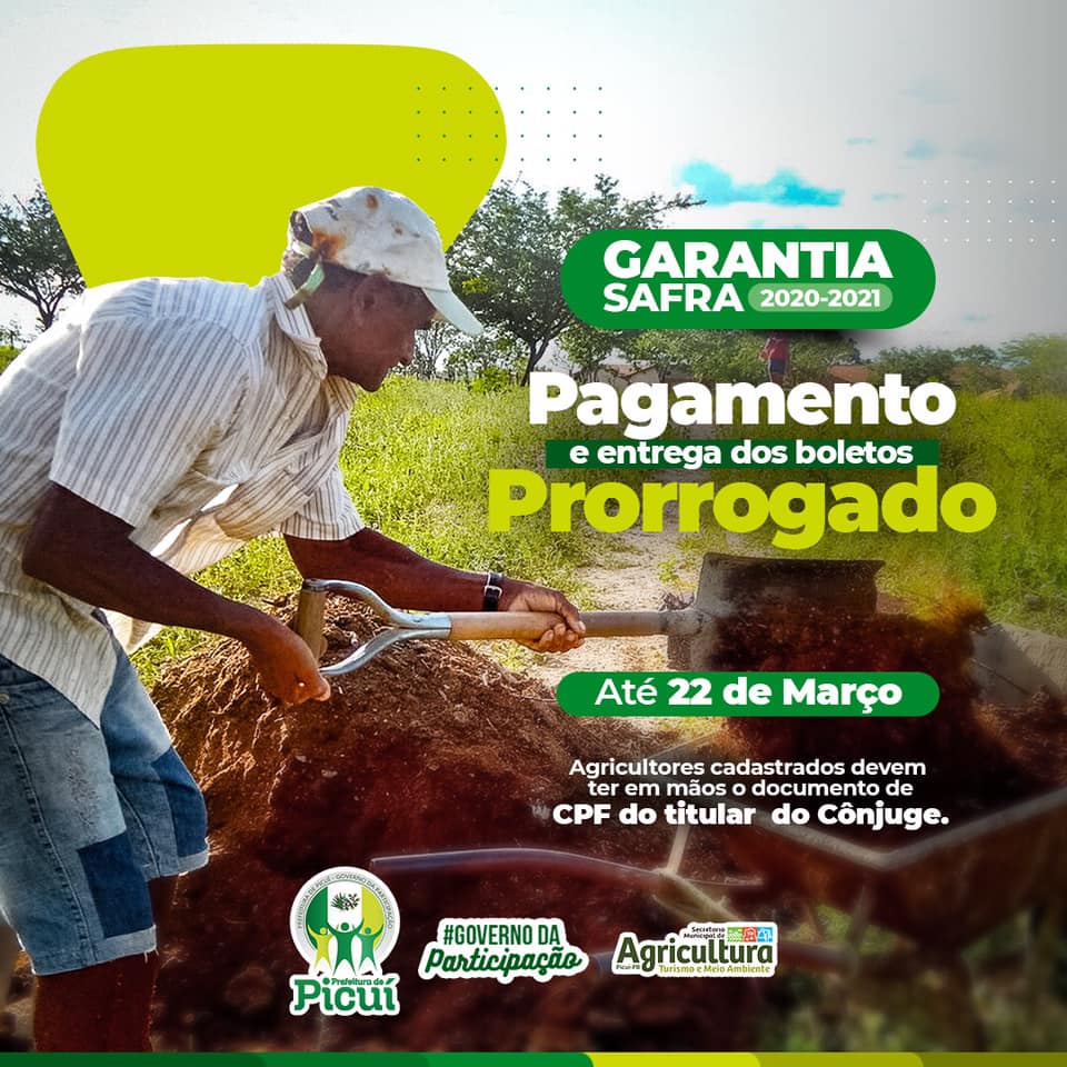 A Secretaria de Agricultura do município de Picuí vem a público comunicar que a entrega dos boletos do garantia safra 2020/2021 foi prorrogada até o dia 22 de março. De acordo com informações fornecidas pela secretaria, a entrega acontecerá por ordem alfabética, no horário de 7:30 às 13:00 horas, na referida secretaria. O prazo para pagamento do documento vai até o dia 22 de março de 2021.