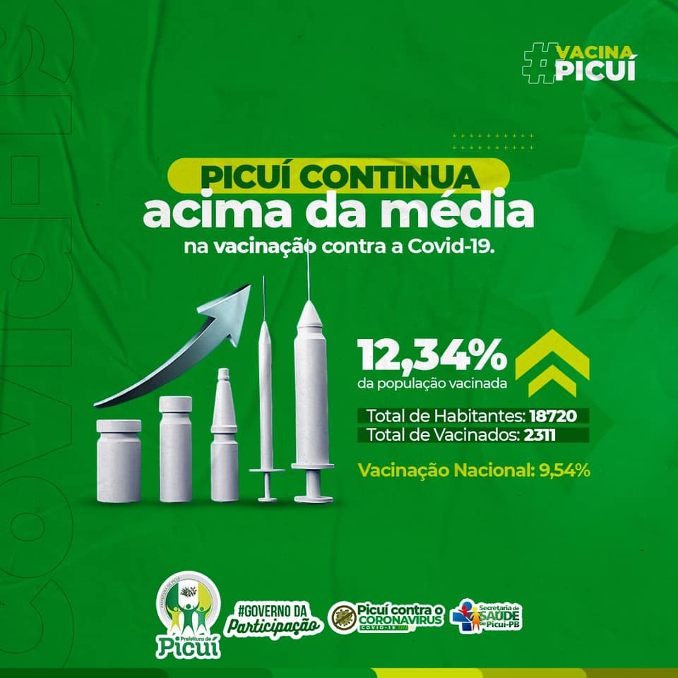 O município de Picuí, com esta importante campanha, está acima da média em vacinação contra a COVID-19, até o momento. Em que o município tem aproximadamente 18720 habitantes e cerca de 2311 pessoas já foram contempladas com a vacinação, o que representa 12,34%, acima da média de vacinação nacional, que é 9,54%.