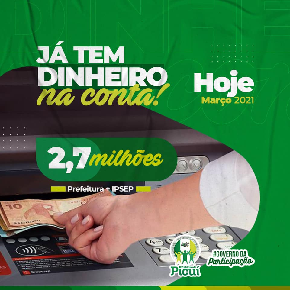 A Prefeitura Municipal de Picuí - Governo da Participação efetuou o pagamento da folha de março de 2021 aos funcionários públicos municipais, assim como também aos aposentados e pensionistas do Instituto de Previdência Social dos Servidores Municipais (IPSEP).