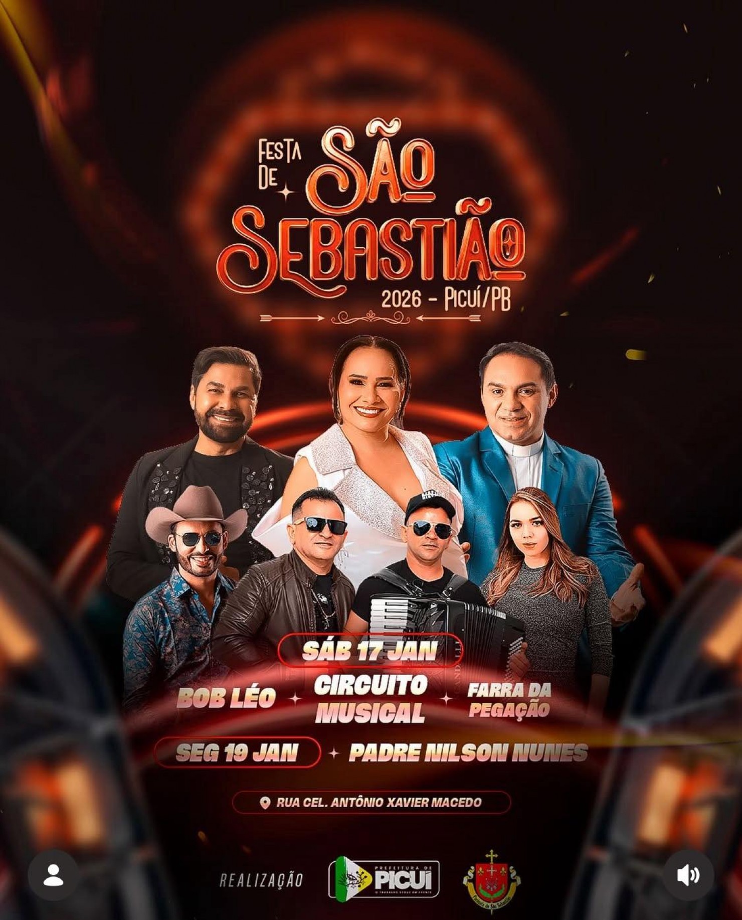 A Prefeitura está dando total apoio com as bandas e artistas locais que estão se apresentando no Coreto (pavilhão da festa) e, para além destas apresentações culturais, no próximo sábado, 17 de janeiro, ainda irão acontecer as apresentações do Circuito Musical, com os shows de Bob Léo e Farra da Pegação, proporcionando momentos de lazer, entretenimento e confraternização para a população. E na segunda-feira, 19 de janeiro, véspera de feriado municipal, também será realizada a celebração religiosa em homenagem ao padroeiro, presidida pelo Padre Nilson Nunes, reforçando a fé e a devoção que fazem parte da história do povo picuiense. Os shows acontecerão na Rua Coronel Antônio Xavier Macedo, espaço tradicional das festividades, com toda a estrutura necessária para garantir um evento organizado, seguro e acessível.