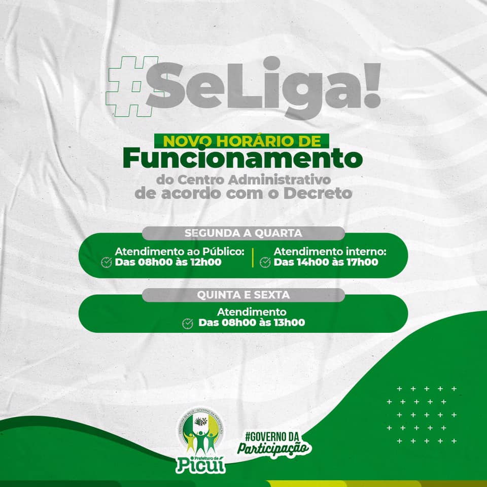 O Centro Administrativo da Prefeitura de Picuí, a partir desta semana, passará a funcionar também durante o período da tarde. Portanto, os horários de funcionamento do Centro Administrativo passaram a ser: De segunda-feira a quarta-feira: 08h às 12 e das 14h às 17h; Nas quintas e sextas, os funcionários trabalharão das 08h às 13h. Os horários de funcionamento tiveram estas mudanças em virtude do novo decreto municipal n 674/2021, que estabeleceu medidas preventivas ao avanço da COVID-19, no município de Picuí.